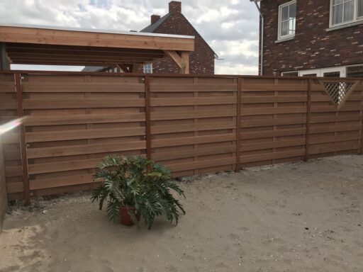 de schutting bestaat uit hardhouten palen met daartussen schuttingdelen horizontaal geplaatst. en als extra optie hebben de bewoners gekozen voor een hardhouten boven balk.