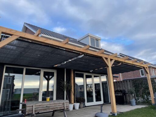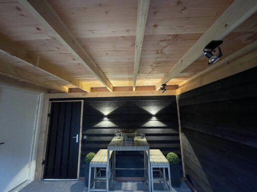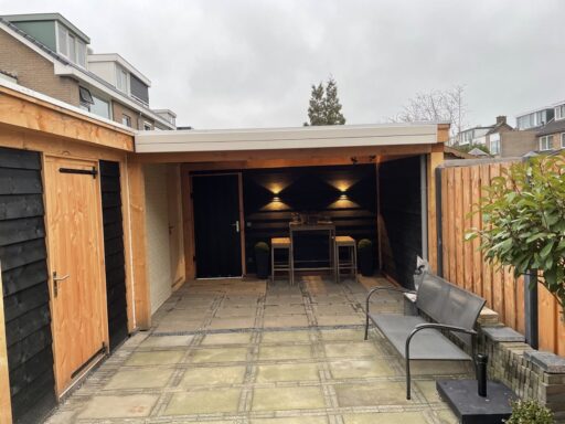 Afgelopen week hebben wij In Vleuten een schuur met een daarbij passende overkapping gemaakt. Beide zijn gemaakt van douglas hout de gevel van de schuur is bekleed met zwarte Zweedse rabat delen en op de hoeken staan onbehandelde Douglas palen.