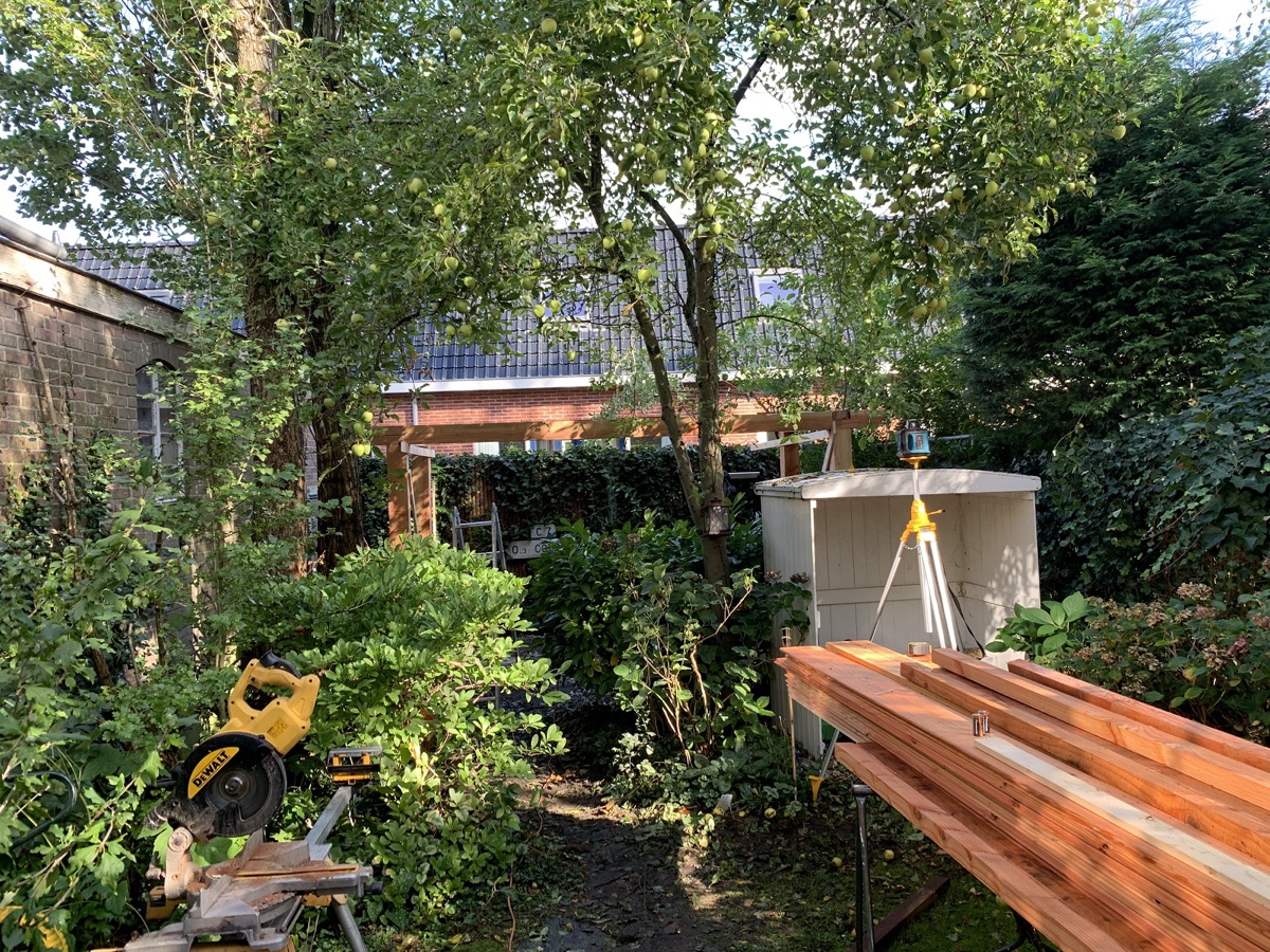 Plaatsen van een traditionele kapschuur van douglas hout in Bodegraven