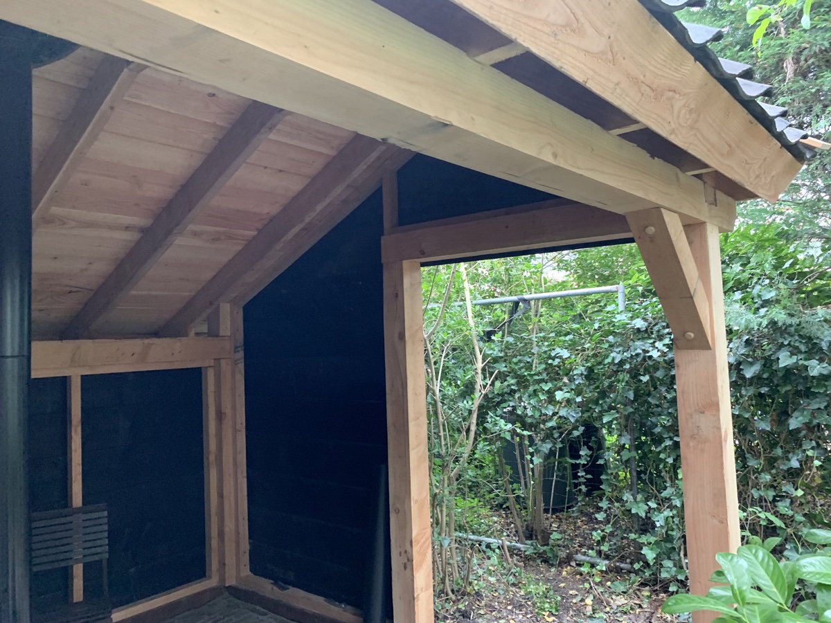 Plaatsen van een traditionele kapschuur van douglas hout in Bodegraven