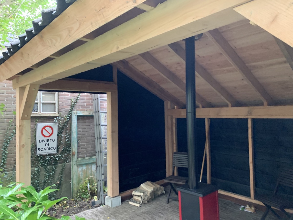 Plaatsen van een traditionele kapschuur van douglas hout in Bodegraven