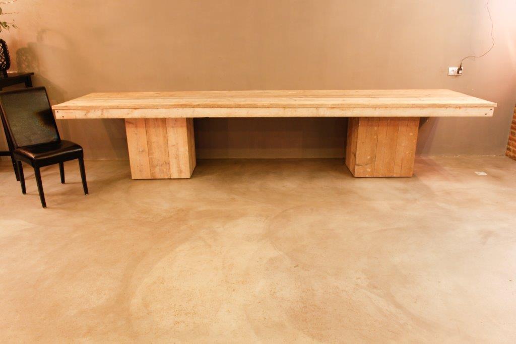 Deze verrijdbare tafel is gemaakt van gebruikte en geborstelde planken van steigerhout. De tafel heeft een afmeting van één meter breed en vier meter lang. De twee poten zijn elk voorzien van draaibare wieltjes.