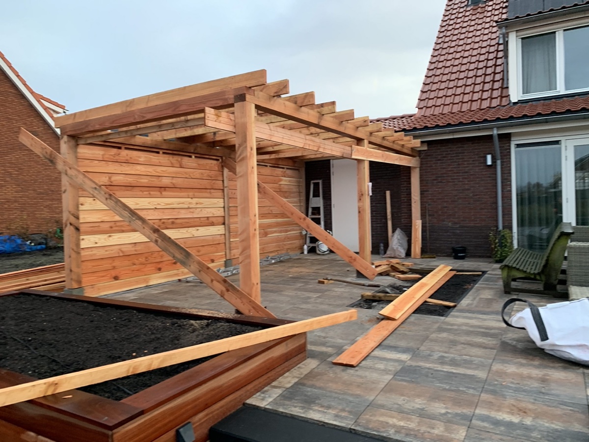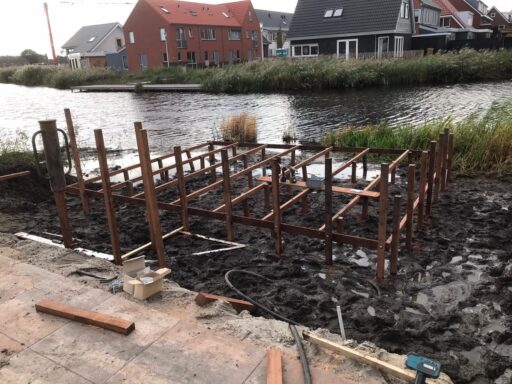 Naast de vlonder hebben wij ook de overkapping geplaatst ,deze rust op schroefpaal fundering met daarop een gestorte poer van beton.
