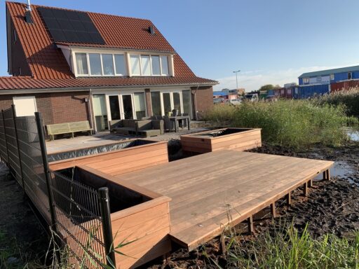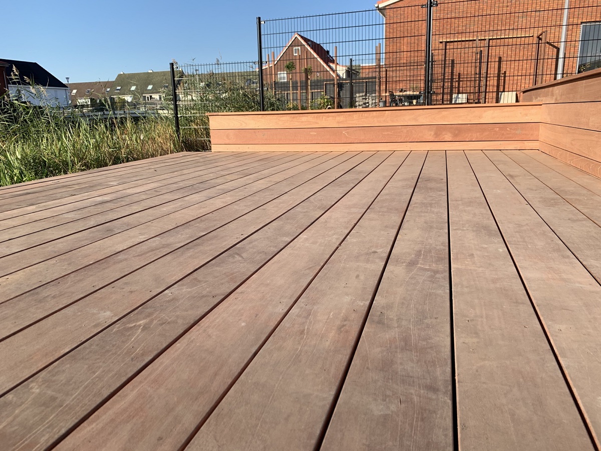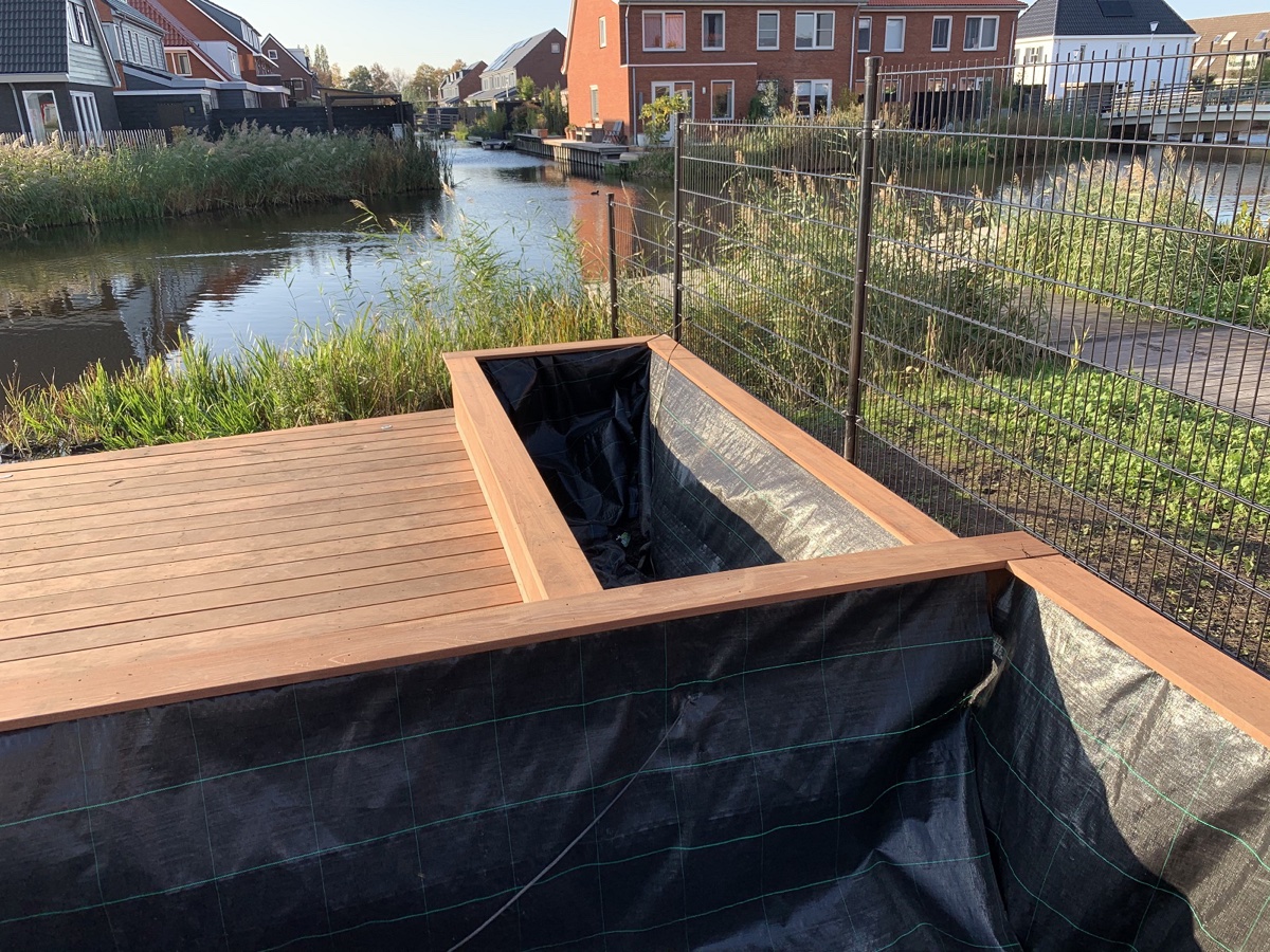 Afgelopen week voor bewoners op de Perengaarde in Boskoop een vlonder en een overkapping gemaakt . de vlonder en de bijhorende bloembakken zijn gemaakt van brede bankiray vlonder delen 28 x 190 mm de bloembakken fungeert tevens als damwand voor het hoger gedeelte van de tuin !