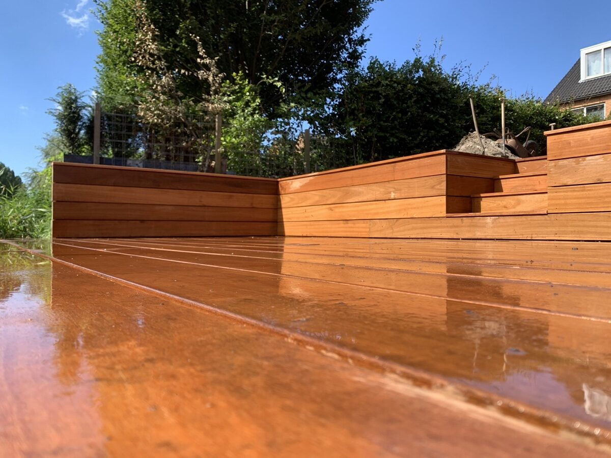 Afgelopen week een vlonder met damwand en uitwendige trap geplaatst in Ypenburg Den Haag deze is gemaakt van brede bankiray vlonder delen na 28x 190mm . de vlonder rust op een regelwerk van hardhouten balken die vervolgens gemonteerd is aan hardhouten palen.