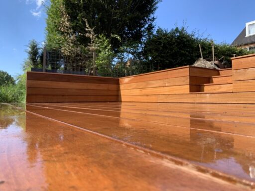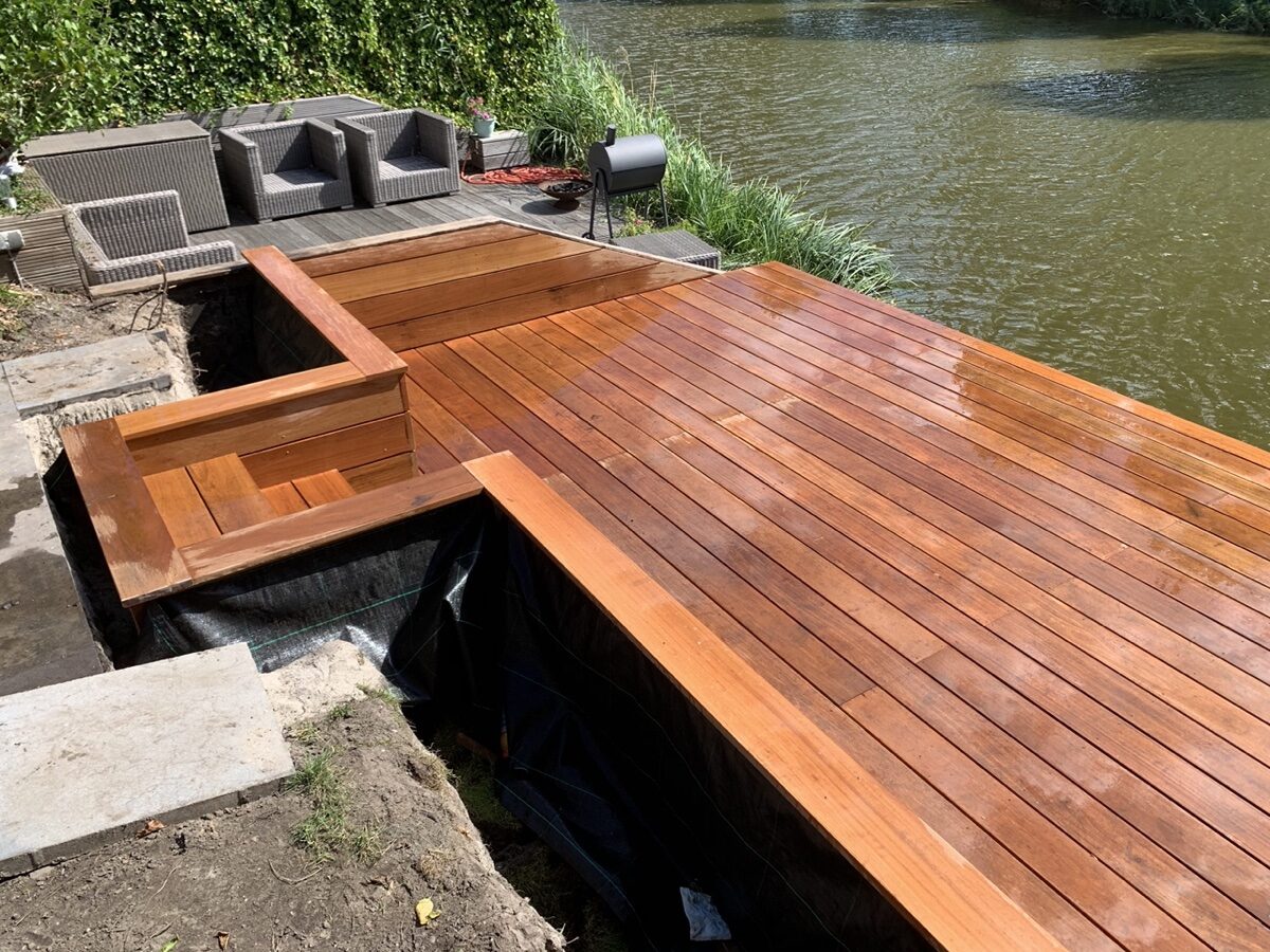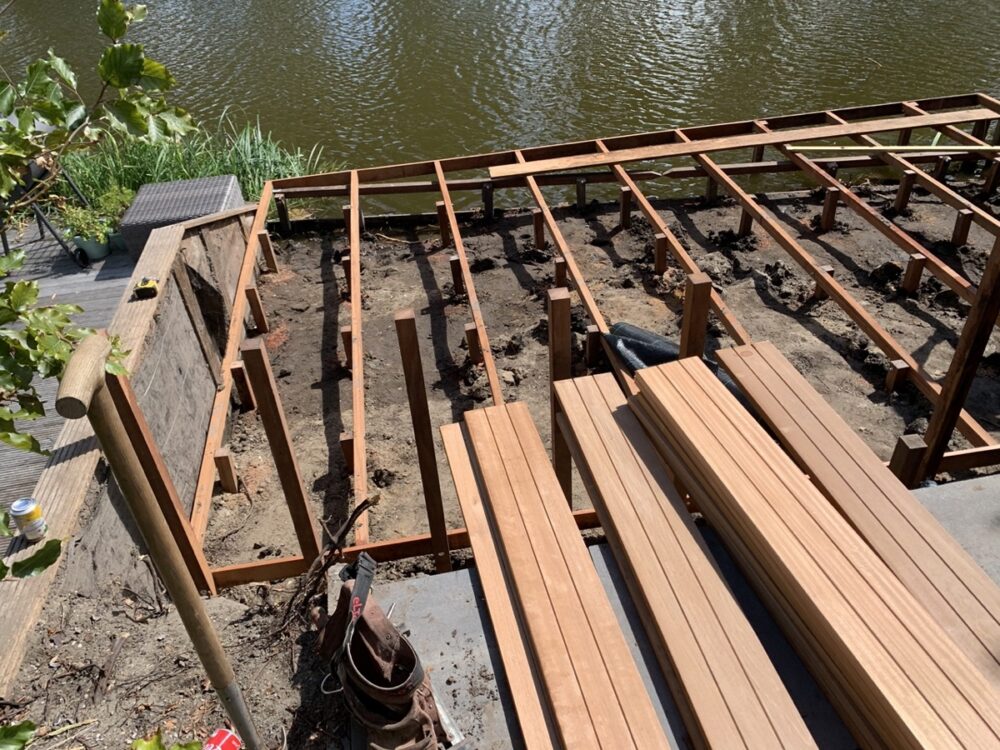 Afgelopen week een vlonder met damwand en uitwendige trap geplaatst in Ypenburg Den Haag deze is gemaakt van brede bankiray vlonder delen na 28x 190mm . de vlonder rust op een regelwerk van hardhouten balken die vervolgens gemonteerd is aan hardhouten palen.