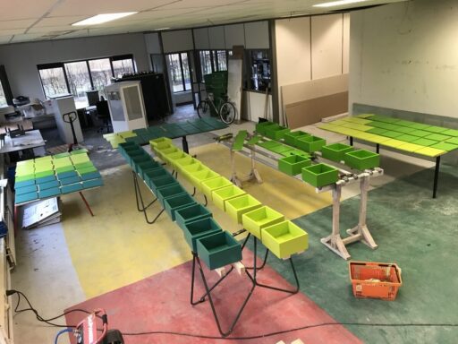 De wand elementen zijn er voor decoratie en de open kubussen zijn er om de producten van Elder Care ten toon te stellen ,ze zijn gemaakt van MDF platen, en geverfd met Sikkens verf in de kleuren van het bedrijf.